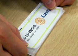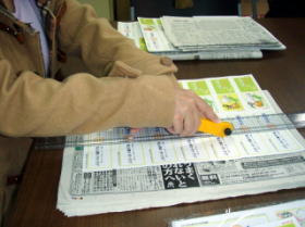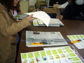 愛媛のおもてなし袋の製作は、印刷・ミシン目入れ・シール貼り作業などすべて障がい者支援事業所で行い、利用者の仕事づくり・工賃向上へとつなげています。 |